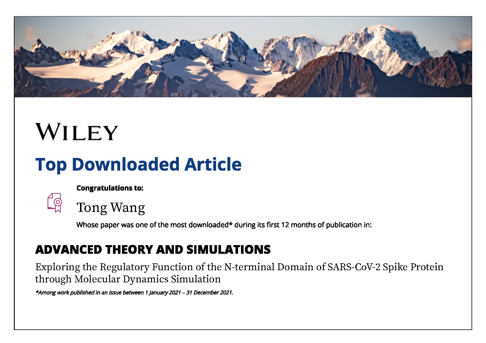 Li, Y., Wang, T.*, Zhang, J., Shao, B., Gong, H.*, Wang, Y., He, X., Liu, S., Liu, T. Y. (2021). Exploring the regulatory function of the N-terminal domain of SARS-CoV-2 Spike protein through molecular dynamics simulation. Adv. Theory Simul., 4(10): 2100152. (Top Downloaded Article Award, Cover)